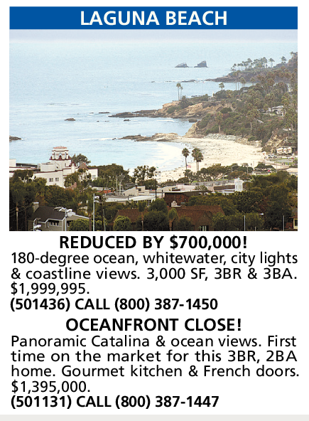 LAGUNA BEACH REDUCED BY $700,000! 180-degree ocean, whitewater, city lights & coastline views. 3,000 SF, 3BR & 3BA. $1,999,995. (501436) CALL (800) 387-1450 OCEANFRONT CLOSE! Panoramic Catalina & ocean views. First time on the market for this 3BR, 2BA home. Gourmet kitchen & French doors. $1,395,000. (501131) CALL (800) 387-1447 See also