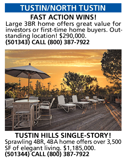 TUSTIN/NORTH TUSTIN FAST ACTION WINS! Large 3BR home offers great value for investors or first-time home buyers. Outstanding location! $290,000. (501343) CALL (800) 387-7922 TUSTIN HILLS SINGLE-STORY! Sprawling 4BR, 4BA home offers over 3,500 SF of elegant living. $1,185,000. (501344) CALL (800) 387-7922