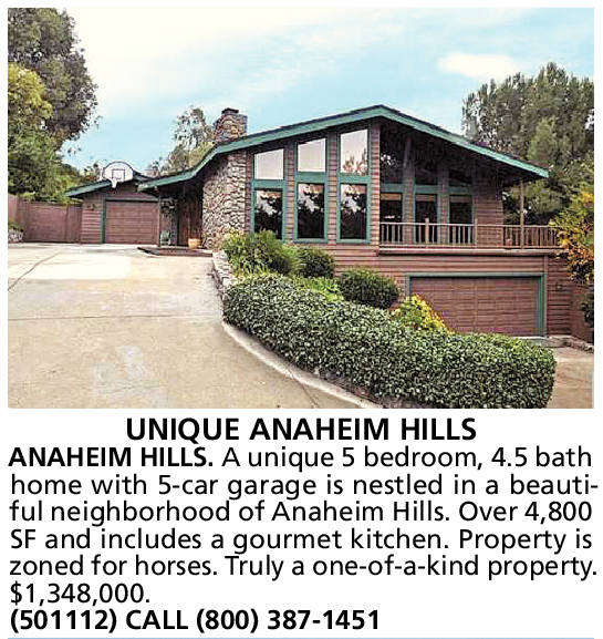 UNIQUE ANAHEIM HILLS ANAHEIM HILLS. A unique 5 bedroom, 4.5 bath home with 5-car garage is nestled in a beautiful neighborhood of Anaheim Hills. Over 4,800 SF and includes a gourmet kitchen. Property is zoned for horses. Truly a one-of-a-kind property. $1,348,000.