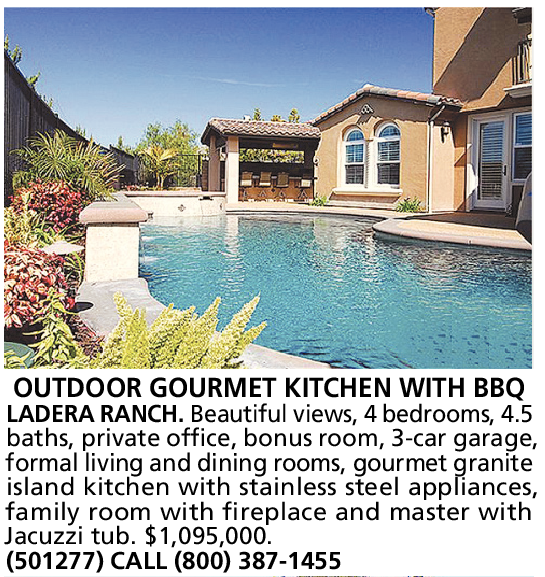 OUTDOOR GOURMET KITCHEN WITH BBQ LADERA RANCH. Beautiful views, 4 bedrooms, 4.5 baths, private office, bonus room, 3-car garage, formal living and dining rooms, gourmet granite island kitchen with stainless steel appliances, family room with fireplace and master with Jacuzzi tub. $1,095,000. (501277) CALL (800) 387-1455