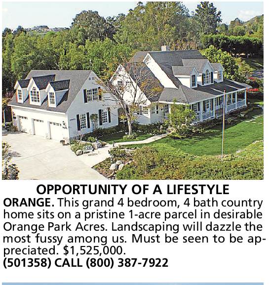 OPPORTUNITY OF A LIFESTYLE ORANGE. This grand 4 bedroom, 4 bath country home sits on a pristine 1-acre parcel in desirable Orange Park Acres. Landscaping will dazzle the most fussy among us. Must be seen to be appreciated. $1,525,000. (501358) CALL (800) 387-7922