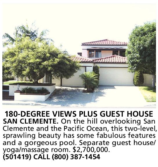 180-DEGREE VIEWS PLUS GUEST HOUSE SAN CLEMENTE. On the hill overlooking San Clemente and the Pacific Ocean, this two-level, sprawling beauty has some fabulous features and a gorgeous pool. Separate guest house/ yoga/massage room. $2,700,000. (501419) CALL (800) 387-1454