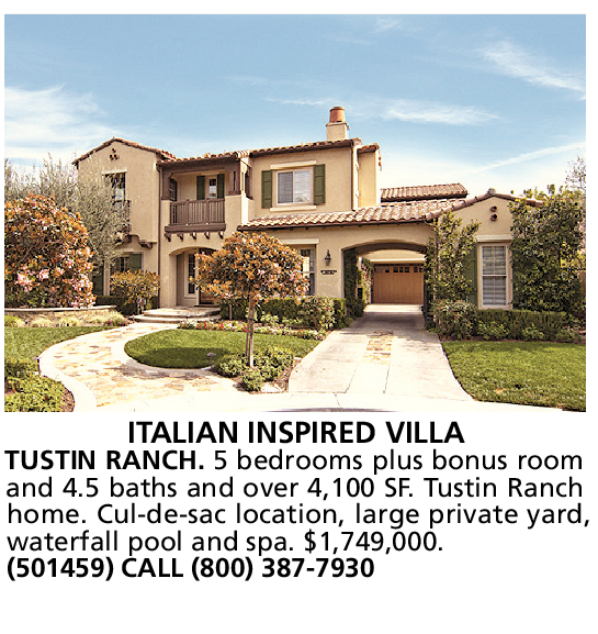 ITALIAN INSPIRED VILLA TUSTIN RANCH. 5 bedrooms plus bonus room and 4.5 baths and over 4,100 SF. Tustin Ranch home. Cul-de-sac location, large private yard, waterfall pool and spa. $1,749,000. (501459) CALL (800) 387-7930