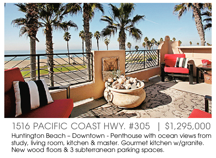 1516 PACIFIC COAST HWY. #305 | $1,295,000 Huntington Beach – Downtown - Penthouse with ocean views from study, living room, kitchen & master. Gourmet kitchen w/granite. New wood floors & 3 subterranean parking spaces.