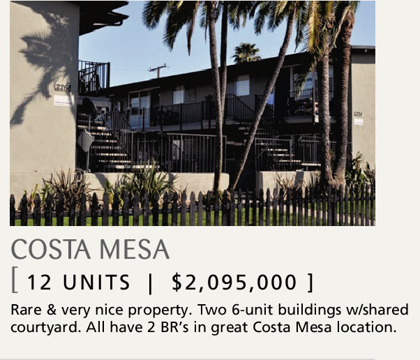 Rare & very nice property. Two 6-unit buildings w/shared courtyard. All have 2 BR’s in great Costa Mesa location.