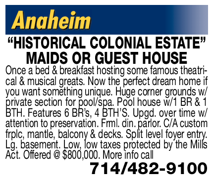 Anaheim “HISTORICAL COLONIAL ESTATE” MAIDS OR GUEST HOUSE Once a bed & breakfast hosting some famous theatrical & musical greats. Now the perfect dream home if you want something unique. Huge corner grounds w/ private section for pool/spa. Pool house w/1 BR & 1 BTH. Features 6 BR’s, 4 BTH’S. Upgd. over time w/ attention to preservation. Frml. din. parlor. C/A custom frplc, mantle, balcony & decks. Split level foyer entry. Lg. basement. Low, low taxes protected by the Mills Act. Offered @ $800,000. More info call 714/482-9100
