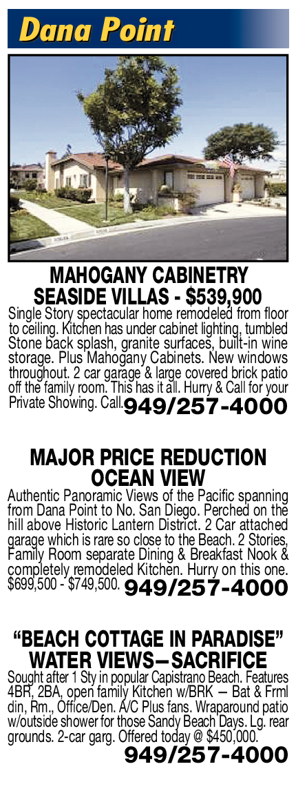 Dana Point MAHOGANY CABINETRY SEASIDE VILLAS - $539,900 Single Story spectacular home remodeled from floor to ceiling. Kitchen has under cabinet lighting, tumbled Stone back splash, granite surfaces, built-in wine storage. Plus Mahogany Cabinets. New windows throughout. 2 car garage & large covered brick patio off the family room. This has it all. Hurry & Call for your Private Showing. Call. 949/257-4000 MAJOR PRICE REDUCTION OCEAN VIEW Authentic Panoramic Views of the Pacific spanning from Dana Point to No. San Diego. Perched on the hill above Historic Lantern District. 2 Car attached garage which is rare so close to the Beach. 2 Stories, Family Room separate Dining & Breakfast Nook & completely remodeled Kitchen. Hurry on this one. $699,500 - $749,500. 949/257-4000 “BEACH COTTAGE IN PARADISE” WATER VIEWS —SACRIFICE Sought after 1 Sty in popular Capistrano Beach. Features 4BR, 2BA, open family Kitchen w/BRK — Bat & Frml din, Rm., Office/Den. A/C Plus fans. Wraparound patio w/outside shower for those Sandy Beach Days. Lg. rear grounds. 2-car garg. Offered today @ $450,000. 949/257-4000