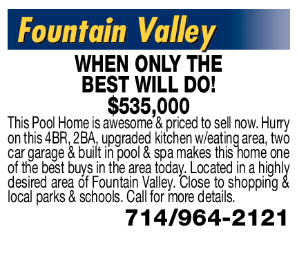 $535,000 This Pool Home is awesome & priced to sell now. Hurry on this 4BR, 2BA, upgraded kitchen w/eating area, two car garage & built in pool & spa makes this home one of the best buys in the area today. Located in a highly desired area of Fountain Valley. Close to shopping & local parks & schools. Call for more details.