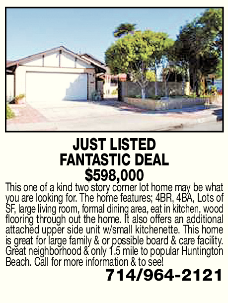 JUST LISTED FANTASTIC DEAL $598,000 This one of a kind two story corner lot home may be what you are looking for. The home features; 4BR, 4BA, Lots of SF, large living room, formal dining area, eat in kitchen, wood flooring through out the home. It also offers an additional attached upper side unit w/small kitchenette. This home is great for large family & or possible board & care facility. Great neighborhood & only 1.5 mile to popular Huntington Beach. Call for more information & to see!
