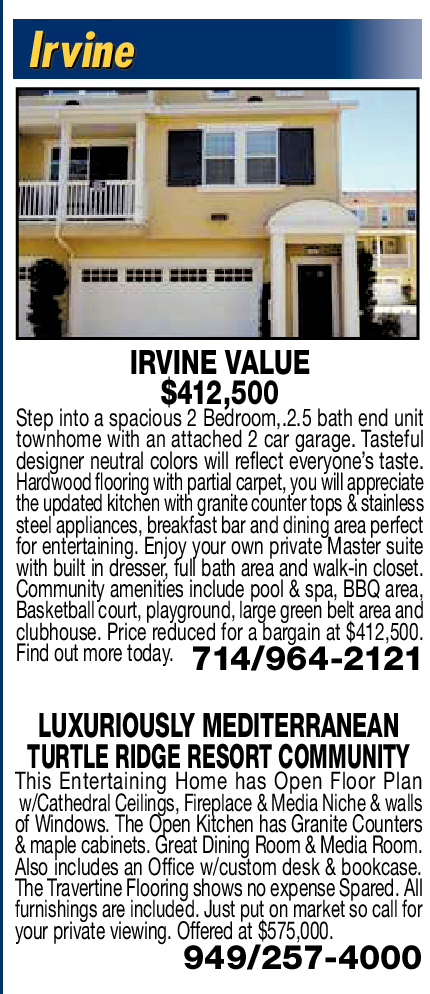 Irvine IRVINE VALUE $412,500 Step into a spacious 2 Bedroom,.2.5 bath end unit townhome with an attached 2 car garage. Tasteful designer neutral colors will reflect everyone’s taste. Hardwood flooring with partial carpet, you will appreciate the updated kitchen with granite counter tops & stainless steel appliances, breakfast bar and dining area perfect for entertaining. Enjoy your own private Master suite with built in dresser, full bath area and walk-in closet. Community amenities include pool & spa, BBQ area, Basketball court, playground, large green belt area and clubhouse. Price reduced for a bargain at $412,500. Find out more today. 714/964-2121 LUXURIOUSLY MEDITERRANEAN TURTLE RIDGE RESORT COMMUNITY This Entertaining Home has Open Floor Plan w/Cathedral Ceilings, Fireplace & Media Niche & walls of Windows. The Open Kitchen has Granite Counters & maple cabinets. Great Dining Room & Media Room. Also includes an Office w/custom desk & bookcase. The Travertine Flooring shows no expense Spared. All furnishings are included. Just put on market so call for your private viewing. Offered at $575,000. 949/257-4000