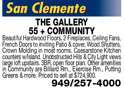 San Clemente THE GALLERY 55 + COMMUNITY Beautiful Hardwood Floors, 2 Fireplaces, Ceiling Fans, French Doors to inviting Patio & cover, Wood Shutters, Crown Molding in most rooms. Caesarstone Kitchen counters w/Island. Unobstructed Hills & City Light views large loft upstairs. 3BR, open floor plan. Other amenities in Community are Billiard Rm., Exercise Rm., Putting Greens & more. Priced to sell at $724,900. 949/257-4000