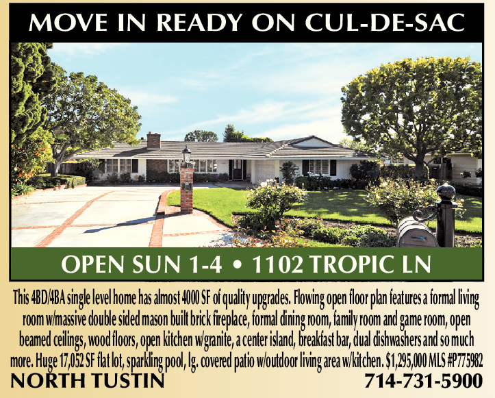 MOVE IN READY ON CUL-DE-SAC OPEN SUN 1-4 • 1102 TROPIC LN This 4BD/4BA single level home has almost 4000 SF of quality upgrades. Flowing open floor plan features a formal living room w/massive double sided mason built brick fireplace, formal dining room, family room and game room, open beamed ceilings, wood floors, open kitchen w/granite, a center island, breakfast bar, dual dishwashers and so much more. Huge 17,052 SF flat lot, sparkling pool, lg. covered patio w/outdoor living area w/kitchen. $1,295,000 MLS #P775982 NORTH TUSTIN 714-731-5900