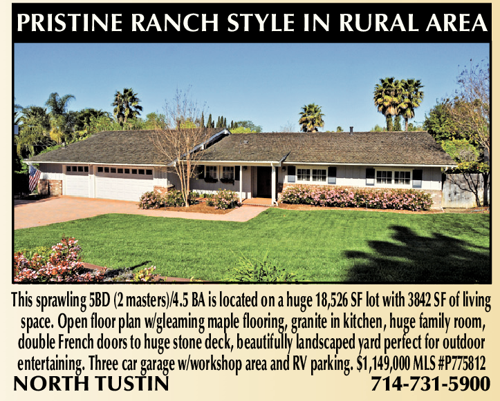 This sprawling 5BD (2 masters)/4.5 BA is located on a huge 18,526 SF lot with 3842 SF of living space. Open floor plan w/gleaming maple flooring, granite in kitchen, huge family room, double French doors to huge stone deck, beautifully landscaped yard perfect for outdoor entertaining. Three car garage w/workshop area and RV parking. $1,149,000 MLS #P775812 NORTH TUSTIN 714-731-5900