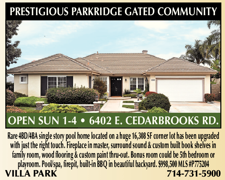 Rare 4BD/4BA single story pool home located on a huge 16,308 SF corner lot has been upgraded with just the right touch. Fireplace in master, surround sound & custom built book shelves in family room, wood flooring & custom paint thru-out. Bonus room could be 5th bedroom or playroom. Pool/spa, firepit, built-in BBQ in beautiful backyard. $998,500 MLS #P775204 VILLA PARK 714-731-5900