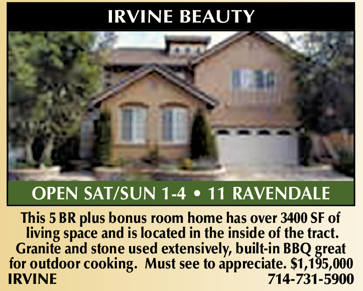 OPEN SAT/SUN 1-4 • 11 RAVENDALE This 5 BR plus bonus room home has over 3400 SF of living space and is located in the inside of the tract. Granite and stone used extensively, built-in BBQ great for outdoor cooking. Must see to appreciate. $1,195,000 IRVINE 714-731-5900 IRVINE BEAUTY