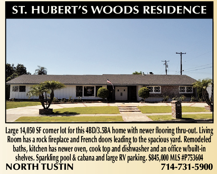 ST. HUBERT’S WOODS RESIDENCE Large 14,050 SF corner lot for this 4BD/3.5BA home with newer flooring thru-out. Living Room has a rock fireplace and French doors leading to the spacious yard. Remodeled baths, kitchen has newer oven, cook top and dishwasher and an office w/built-in shelves. Sparkling pool & cabana and large RV parking. $845,000 MLS #P753604 NORTH TUSTIN 714-731-5900