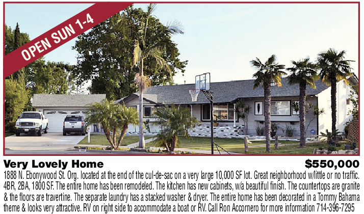 Very Lovely Home $550,000 1888 N. Ebonywood St. Org. located at the end of the cul-de-sac on a very large 10,000 SF lot. Great neighborhood w/little or no traffic. 4BR, 2BA, 1800 SF. The entire home has been remodeled. The kitchen has new cabinets, w/a beautiful finish. The countertops are granite & the floors are travertine. The separate laundry has a stacked washer & dryer. The entire home has been decorated in a Tommy Bahama theme & looks very attractive. RV on right side to accommodate a boat or RV. Call Ron Accornero for more information 714-396-7295