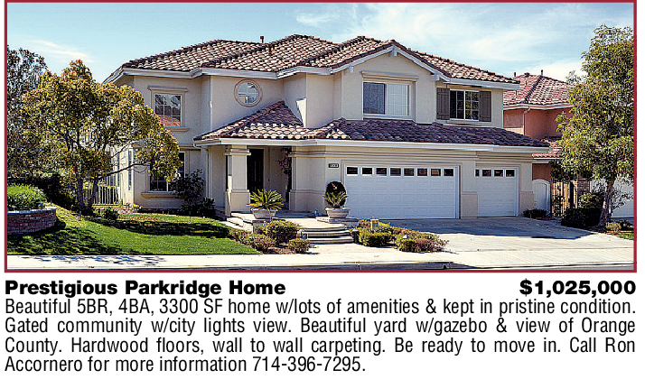 Prestigious Parkridge Home $1,025,000 Beautiful 5BR, 4BA, 3300 SF home w/lots of amenities & kept in pristine condition. Gated community w/city lights view. Beautiful yard w/gazebo & view of Orange County. Hardwood floors, wall to wall carpeting. Be ready to move in. Call Ron Accornero for more information 714-396-7295.