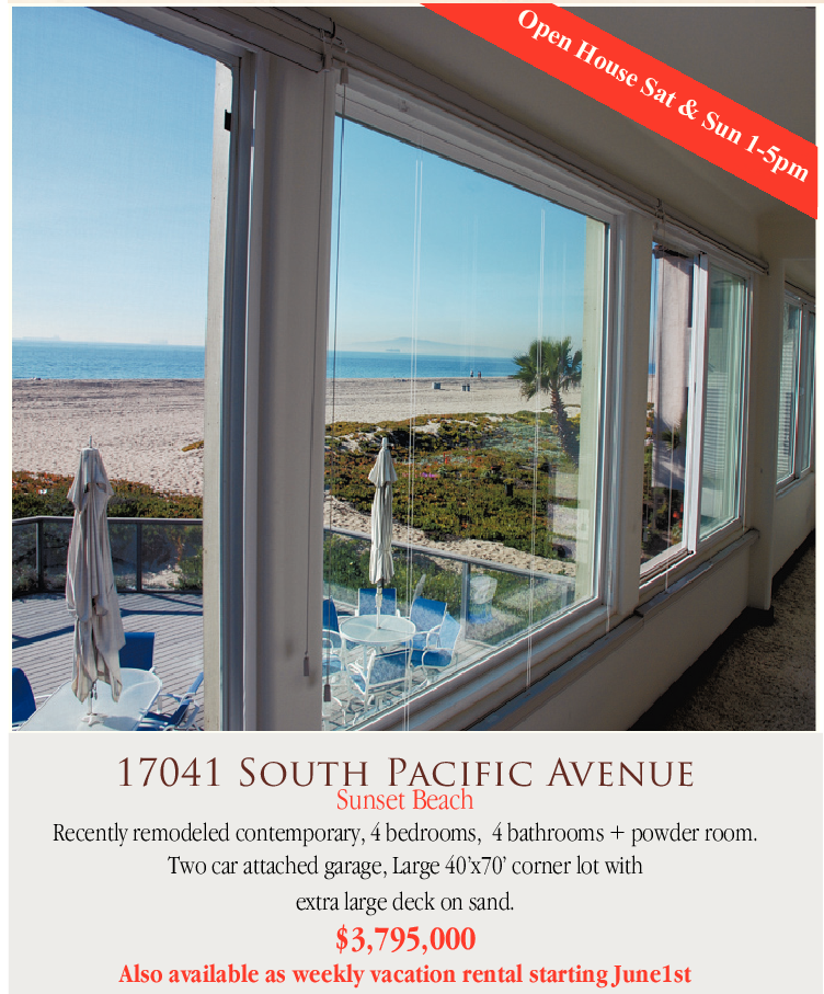 17041 South Pacific Avenue Sunset Beach Recently remodeled contemporary, 4 bedrooms, 4 bathrooms + powder room. Two car attached garage, Large 40’x70’ corner lot with extra large deck on sand. $3,795,000 Also available as weekly vacation rental starting June1st