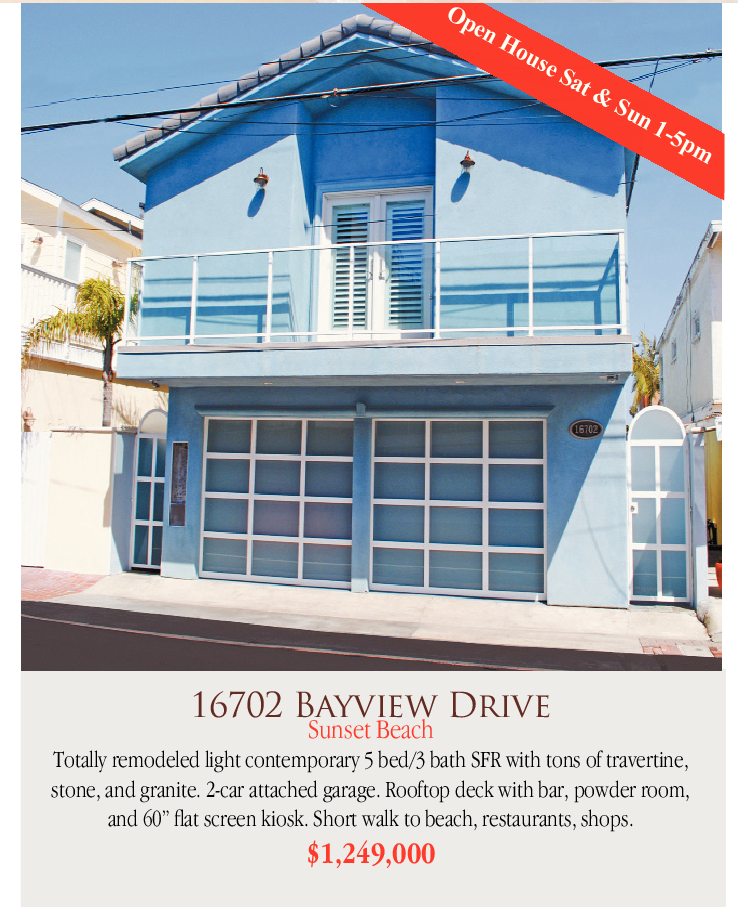 16702 Bayview Drive Sunset Beach Totally remodeled light contemporary 5 bed/3 bath SFR with tons of travertine, stone, and granite. 2-car attached garage. Rooftop deck with bar, powder room, and 60” flat screen kiosk. Short walk to beach, restaurants, shops. $1,249,000