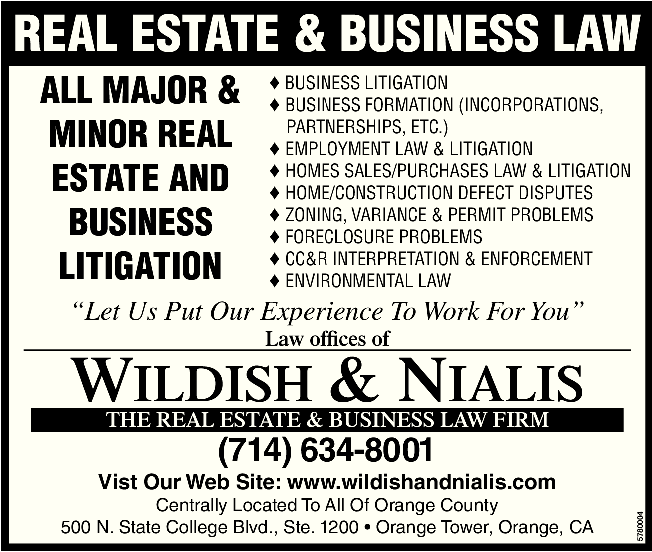 EMPLOYMENT LAW & LITIGATION HOMES SALES/PURCHASES LAW & LITIGATION HOME/CONSTRUCTION DEFECT DISPUTES ZONING, VARIANCE & PERMIT PROBLEMS FORECLOSURE PROBLEMS CC&R INTERPRETATION & ENFORCEMENT ENVIRONMENTAL LAW