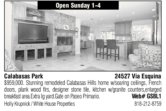 Calabasas Park 24527 Via Esquina $959,000. Stunning remodeled Calabasas Hills home w/soaring ceilings, French doors, plank wood flrs, designer stone tile, kitchen w/granite counters,enlarged breakfast area.Extra lg yard.Gate on Paseo Primario. Web# GSBL1 Holly Krupnick / White House Properties 818-212-8759