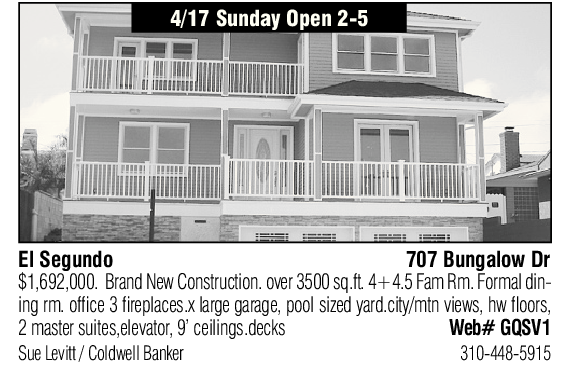 4/17 Sunday Open 2-5 El Segundo 707 Bungalow Dr $1,692,000. Brand New Construction. over 3500 sq.ft. 4+4.5 Fam Rm. Formal dining rm. office 3 fireplaces.x large garage, pool sized yard.city/mtn views, hw floors, 2 master suites,elevator, 9’ ceilings.decks Web# GQSV1 Sue Levitt / Coldwell Banker 310-448-5915