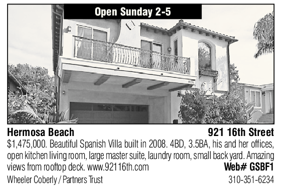 Hermosa Beach 921 16th Street open kitchen living room, large master suite, laundry room, small back yard. Amazing $1,475,000. Beautiful Spanish Villa built in 2008. 4BD, 3.5BA, his and her offices, views from rooftop deck. www.92116th.com Web# GSBF1 Wheeler Coberly / Partners Trust 310-351-6234