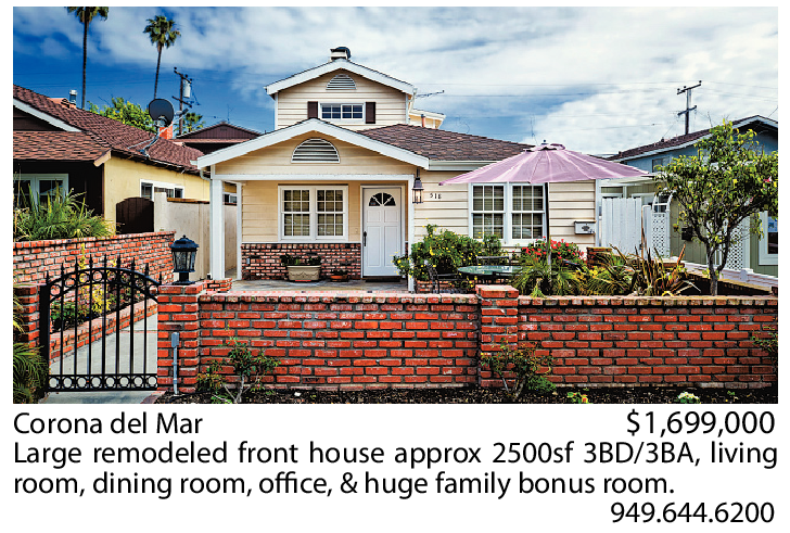 Corona del Mar $1,699,000 Large remodeled front house approx 2500sf 3BD/3BA, living room, dining room, office, & huge family bonus room.