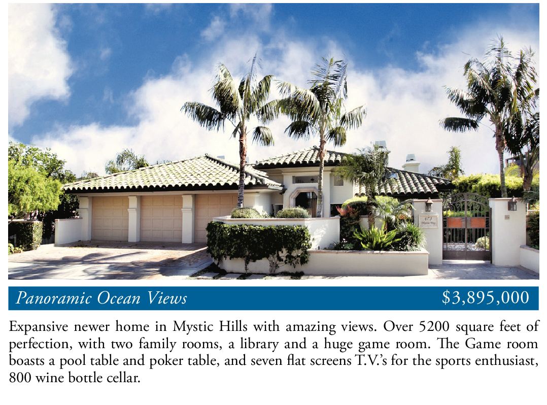 Panoramic Ocean Views $3,895,000 Expansive newer home in Mystic Hills with amazing views. Over 5200 square feet of perfection, with two family rooms, a library and a huge game room. The Game room boasts a pool table and poker table, and seven flat screens T.V.’s for the sports enthusiast, 800 wine bottle cellar.