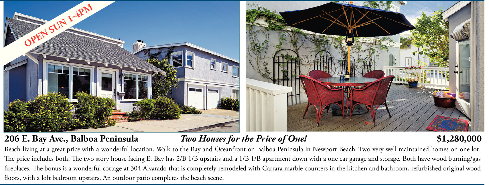206 E. Bay Ave., Balboa Peninsula Two Houses for the Price of One! $1,280,000 Beach living at a great price with a wonderful location. Walk to the Bay and Oceanfront on Balboa Peninsula in Newport Beach. Two very well maintained homes on one lot. The price includes both. The two story house facing E. Bay has 2/B 1/B upstairs and a 1/B 1/B apartment down with a one car garage and storage. Both have wood burning/gas fireplaces. The bonus is a wonderful cottage at 304 Alvarado that is completely remodeled with Carrara marble counters in the kitchen and bathroom, refurbished original wood floors, with a loft bedroom upstairs. An outdoor patio completes the beach scene.
