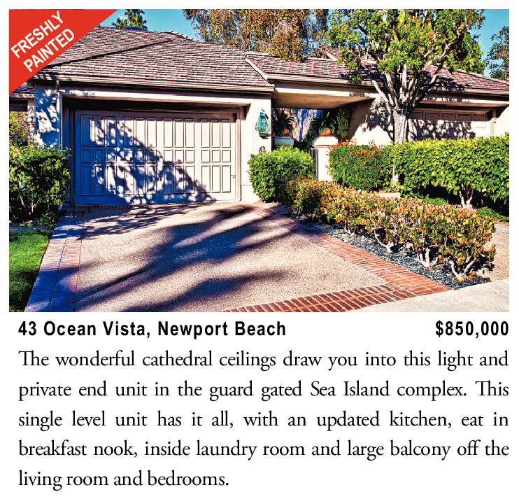 43 Ocean Vista, Newport Beach $850,000 The wonderful cathedral ceilings draw you into this light and private end unit in the guard gated Sea Island complex. This single level unit has it all, with an updated kitchen, eat in breakfast nook, inside laundry room and large balcony off the living room and bedrooms.