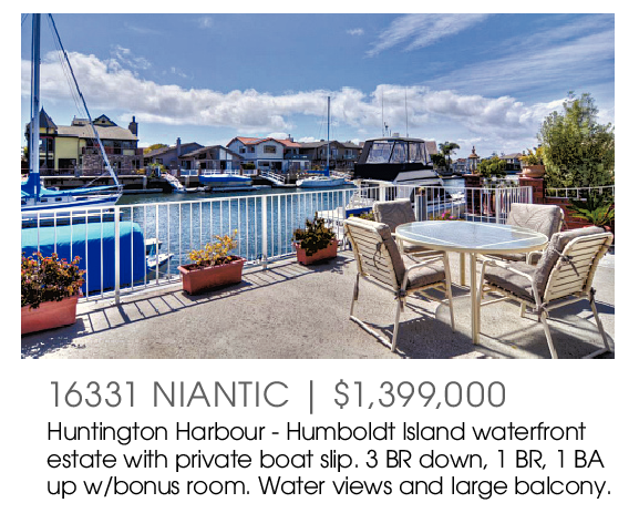 16331 NIANTIC | $1,399,000 Huntington Harbour - Humboldt Island waterfront estate with private boat slip. 3 BR down, 1 BR, 1 BA up w/bonus room. Water views and large balcony.