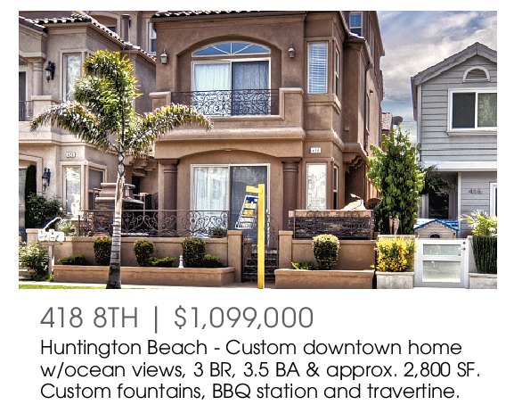 418 8TH | $1,099,000 Huntington Beach - Custom downtown home w/ocean views, 3 BR, 3.5 BA & approx. 2,800 SF. Custom fountains, BBQ station and travertine.