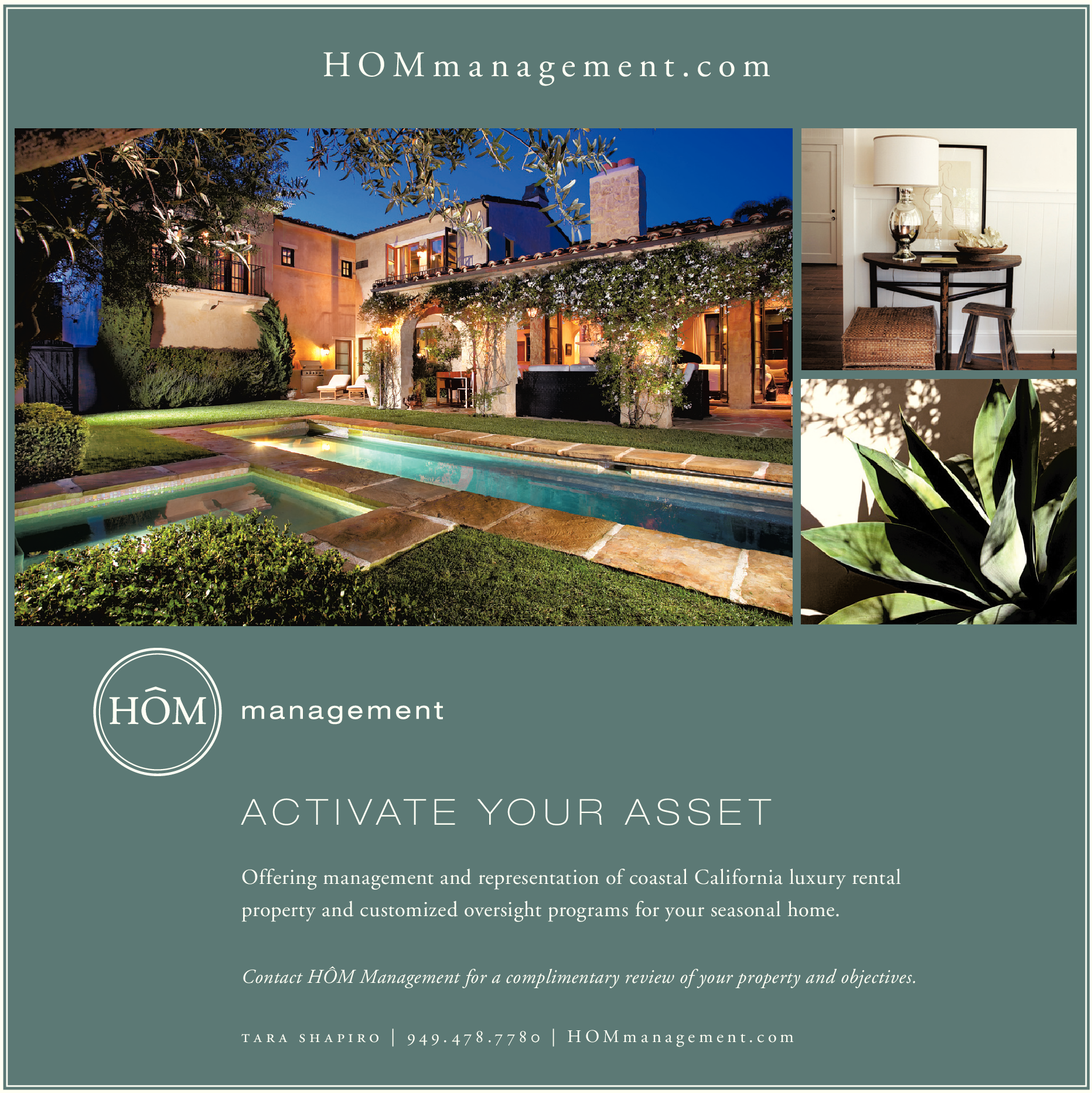 H O M m a n a g e m e n t . c o m A C T I V AT E Y O U R A S S E T Offering management and representation of coastal California luxury rental property and customized oversight programs for your seasonal home. Contact HÔM Management for a complimentary review of your property and objectives. ta r a s h a pi ro | 94 9 . 47 8 .7 7 8 0 | HOM m a n a g e me nt .c om
