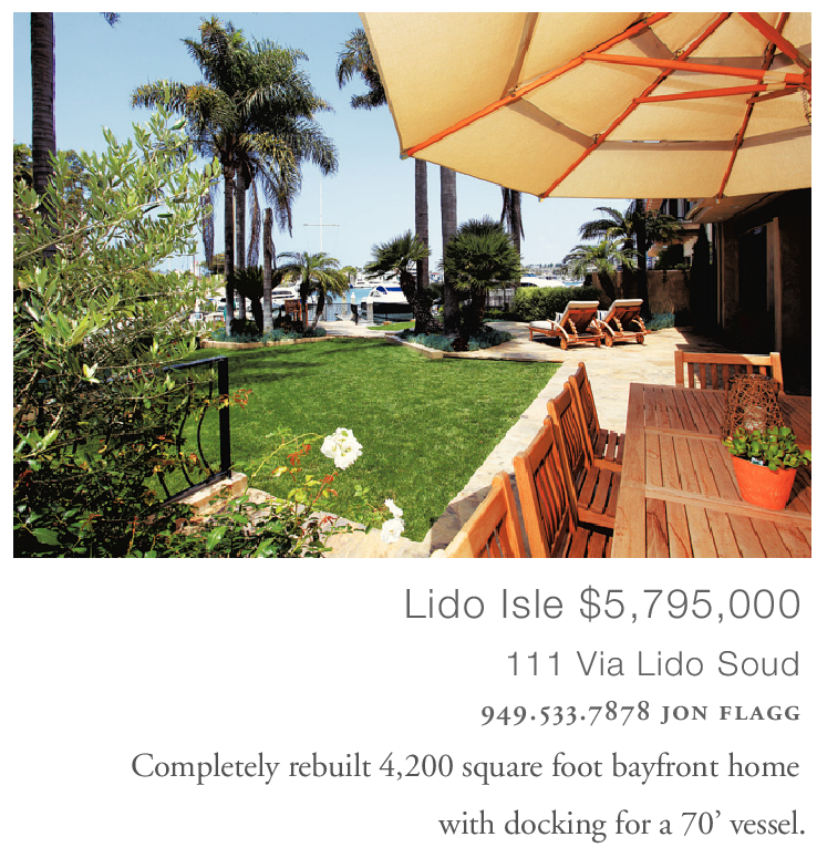 Lido Isle $5,795,000 111 Via Lido Soud 949.533.7878 jon flagg Completely rebuilt 4,200 square foot bayfront home with docking for a 70’ vessel.