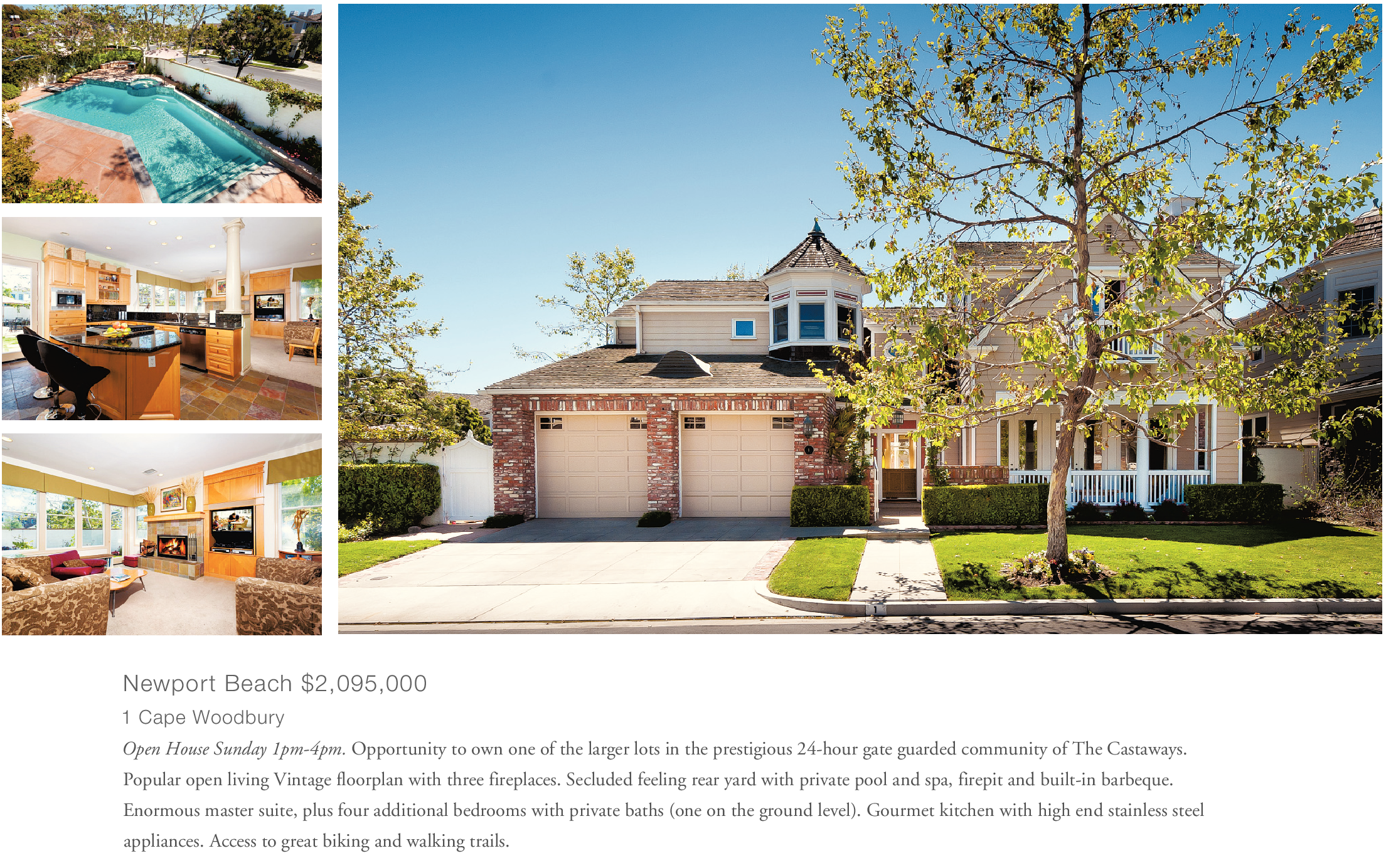 Newport Beach $2,095,000 1 Cape Woodbury Open House Sunday 1pm-4pm. Opportunity to own one of the larger lots in the prestigious 24-hour gate guarded community of The Castaways. Popular open living Vintage floorplan with three fireplaces. Secluded feeling rear yard with private pool and spa, firepit and built-in barbeque. Enormous master suite, plus four additional bedrooms with private baths (one on the ground level). Gourmet kitchen with high end stainless steel appliances. Access to great biking and walking trails.