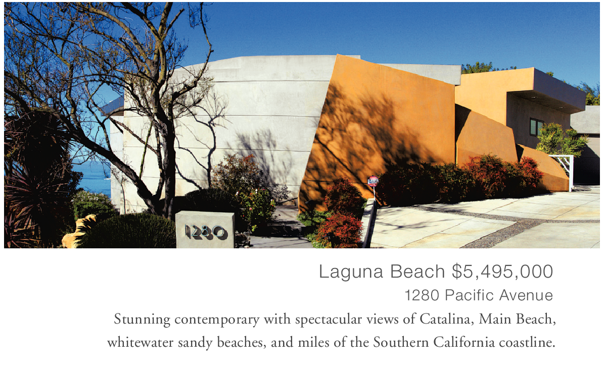 Laguna Beach $5,495,000 1280 Pacific Avenue Stunning contemporary with spectacular views of Catalina, Main Beach, whitewater sandy beaches, and miles of the Southern California coastline.