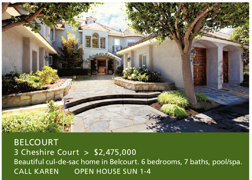 BELCOURT 3 Cheshire Court > $2,475,000 Beautiful cul-de-sac home in Belcourt. 6 bedrooms, 7 baths, pool/spa. CALL KAREN OPEN HOUSE SUN 1-4