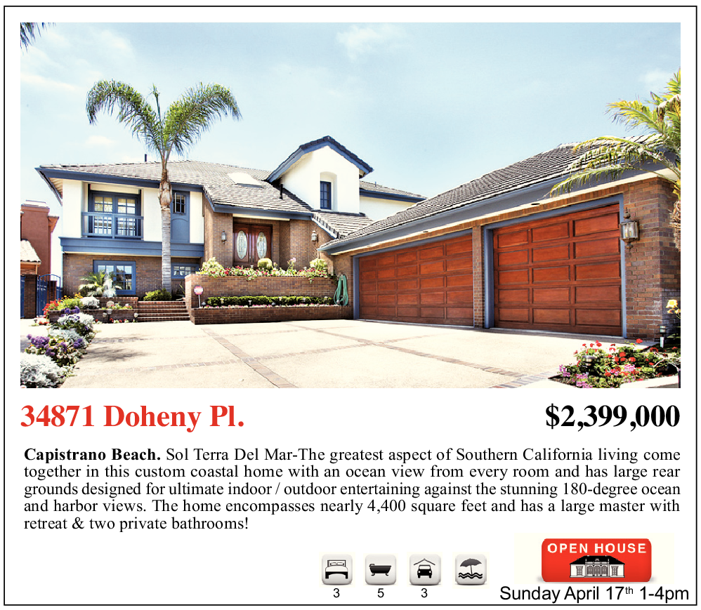 34871 Doheny Pl. $2,399,000 Capistrano Beach. Sol Terra Del Mar-The greatest aspect of Southern California living come together in this custom coastal home with an ocean view from every room and has large rear grounds designed for ultimate indoor / outdoor entertaining against the stunning 180-degree ocean and harbor views. The home encompasses nearly 4,400 square feet and has a large master with retreat & two private bathrooms! Sunday April 17 th 1-4pm 3 5 3