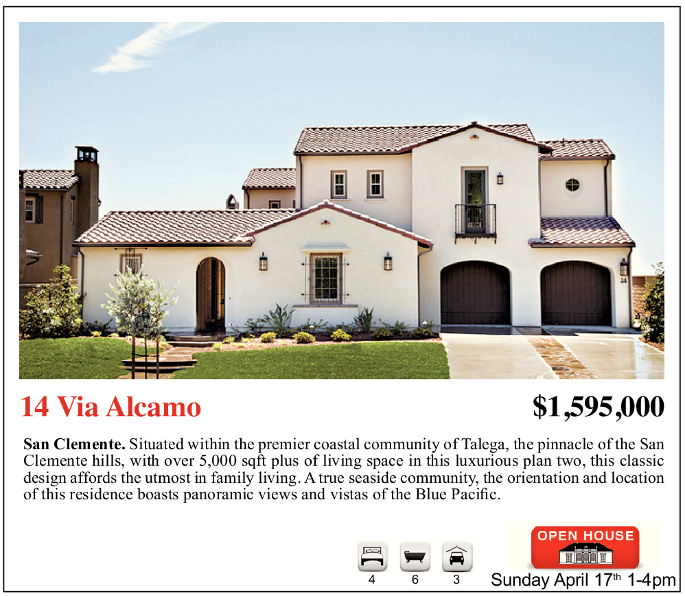 14 Via Alcamo $1,595,000 San Clemente. Situated within the premier coastal community of Talega, the pinnacle of the San Clemente hills, with over 5,000 sqft plus of living space in this luxurious plan two, this classic design affords the utmost in family living. A true seaside community, the orientation and location of this residence boasts panoramic views and vistas of the Blue Pacific. 3 4 6 Sunday April 17 th 1-4pm