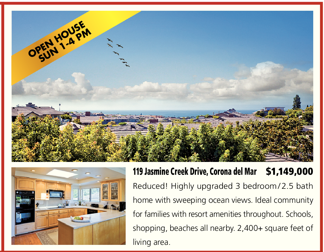 119 Jasmine Creek Drive, Corona del Mar $1,149,000 Reduced! Highly upgraded 3 bedroom / 2.5 bath home with sweeping ocean views. Ideal community for families with resort amenities throughout. Schools, shopping, beaches all nearby. 2,400+ square feet of living area.