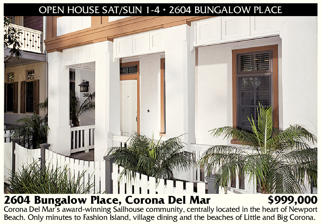 $1,499,000 master OPEN HOUSE SAT/SUN 1-4 • 2604 BUNGALOW PLACE 2604 Bungalow Place, Corona Del Mar $999,000 Corona Del Mar’s award-winning Sailhouse community, centrally located in the heart of Newport Beach. Only minutes to Fashion Island, village dining and the beaches of Little and Big Corona.