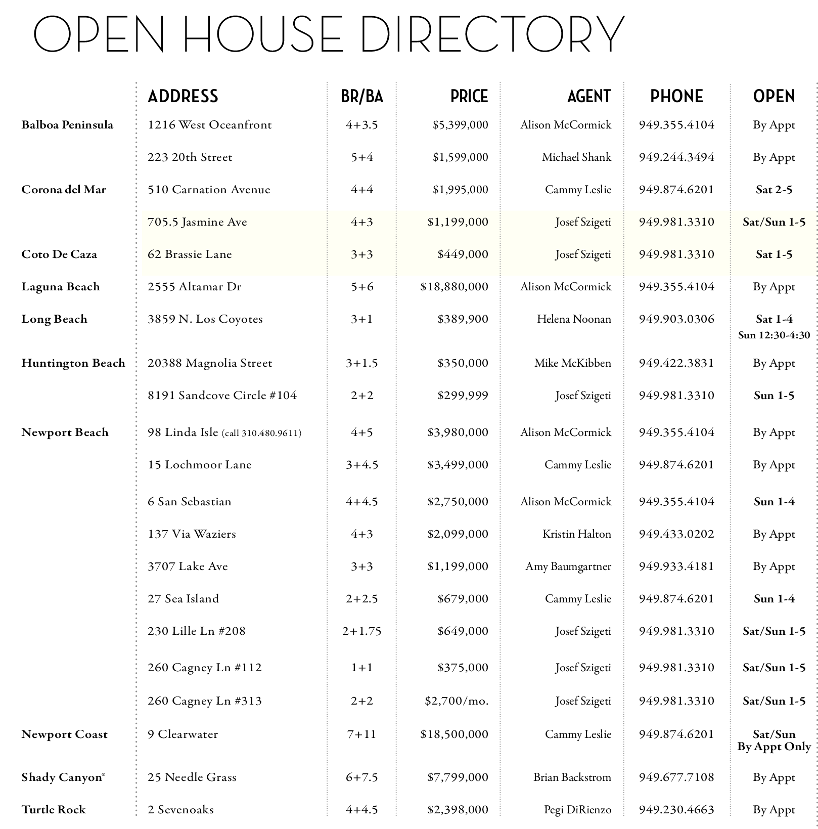 Corona del Mar 510 Carnation Avenue 4+4 $1,995,000 Cammy Leslie 949.874.6201 Sat 2-5
