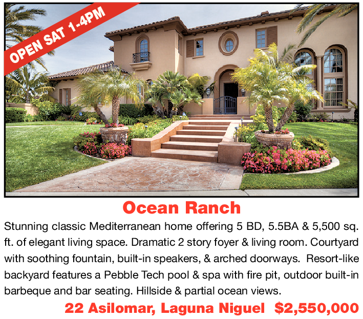 Ocean Ranch Stunning classic Mediterranean home offering 5 BD, 5.5BA & 5,500 sq. ft. of elegant living space. Dramatic 2 story foyer & living room. Courtyard with soothing fountain, built-in speakers, & arched doorways. Resort-like backyard features a Pebble Tech pool & spa with fire pit, outdoor built-in barbeque and bar seating. Hillside & partial ocean views. 22 Asilomar, Laguna Niguel $2,550,000