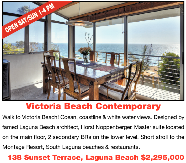 Victoria Beach Contemporary Walk to Victoria Beach! Ocean, coastline & white water views. Designed by famed Laguna Beach architect, Horst Noppenberger. Master suite located on the main floor, 2 secondary BRs on the lower level. Short stroll to the Montage Resort, South Laguna beaches & restaurants. 138 Sunset Terrace, Laguna Beach $2,295,000