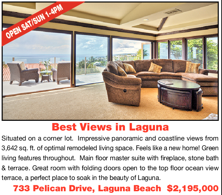 Best Views in Laguna Situated on a corner lot. Impressive panoramic and coastline views from 3,642 sq. ft. of optimal remodeled living space. Feels like a new home! Green living features throughout. Main floor master suite with fireplace, stone bath & terrace. Great room with folding doors open to the top floor ocean view terrace, a perfect place to soak in the beauty of Laguna. 733 Pelican Drive, Laguna Beach $2,195,000