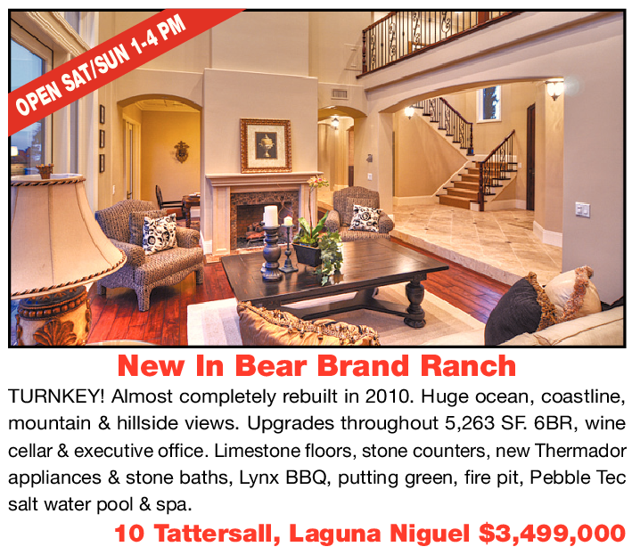 New In Bear Brand Ranch TURNKEY! Almost completely rebuilt in 2010. Huge ocean, coastline, mountain & hillside views. Upgrades throughout 5,263 SF. 6BR, wine cellar & executive office. Limestone floors, stone counters, new Thermador appliances & stone baths, Lynx BBQ, putting green, fire pit, Pebble Tec salt water pool & spa. 10 Tattersall, Laguna Niguel $3,499,000