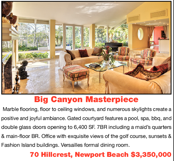 Marble flooring, floor to ceiling windows, and numerous skylights create a positive and joyful ambiance. Gated courtyard features a pool, spa, bbq, and double glass doors opening to 6,400 SF. 7BR including a maid’s quarters & main-floor BR. Office with exquisite views of the golf course, sunsets & Fashion Island buildings. Versailles formal dining room.