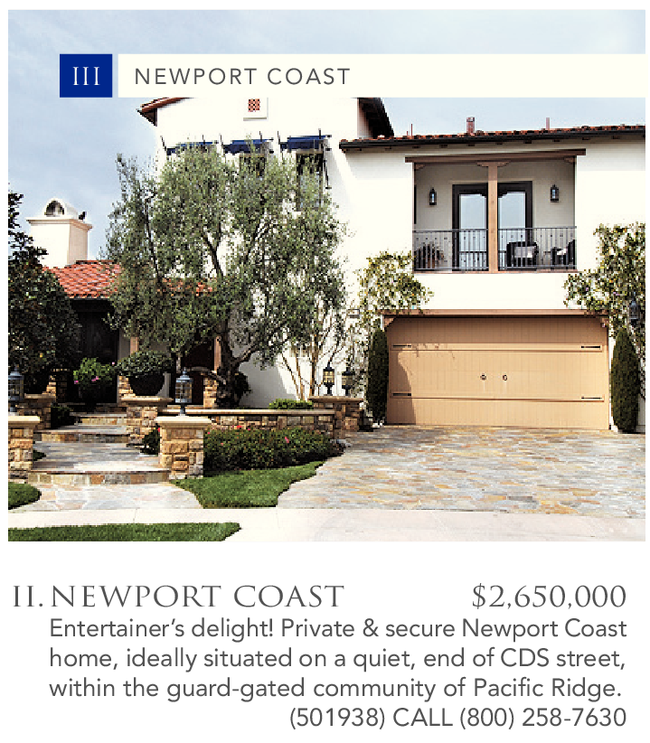 II. NEWPORT COAST $2,650,000 Entertainer’s delight! Private & secure Newport Coast home, ideally situated on a quiet, end of CDS street, within the guard-gated community of Pacific Ridge.